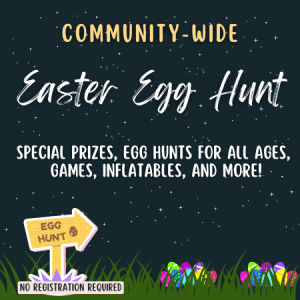 FREE! Community-Wide Easter Egg Hunt Saturday, April 4, 2026 Bring your family, friends, or just you for an awesome evening! There will be Special Prizes, Egg Hunts for ALL ages, Games, Inflatables, and More! No Registration Required! Just come out and join the FUN! If you have any questions regarding attending or volunteering at the Egg Hunt, please contact a ...
